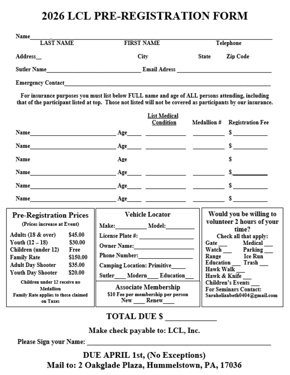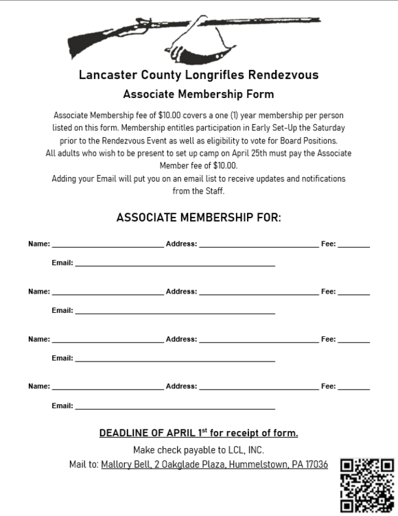 The Lancaster County Longrifles Historical Encampment recreates the culture and technology of the pre-1840 Fur Trade Era. All clothing, accoutrements and camp gear must reflect this historic period.